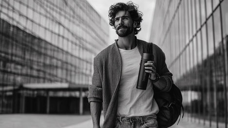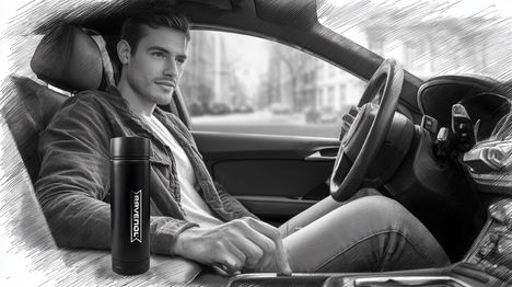 Moderner, dynamischer Alltag. Ein Mann (30-35 Jahre) zeigt die Vorteile und den Komfort des RAVENOL-Thermobechers. Einsatz in verschiedenen Situationen: im Auto im Getränkehalter, unterwegs in der Stadt, vor wichtigen Terminen, im Büro. Klare Nahaufnahmen: Wie der Becher geöffnet wird, dass er nicht ausläuft, wie er die Temperatur hält. Elegantes, urbanes Umfeld, selbstbewusster, dynamischer Rhythmus.